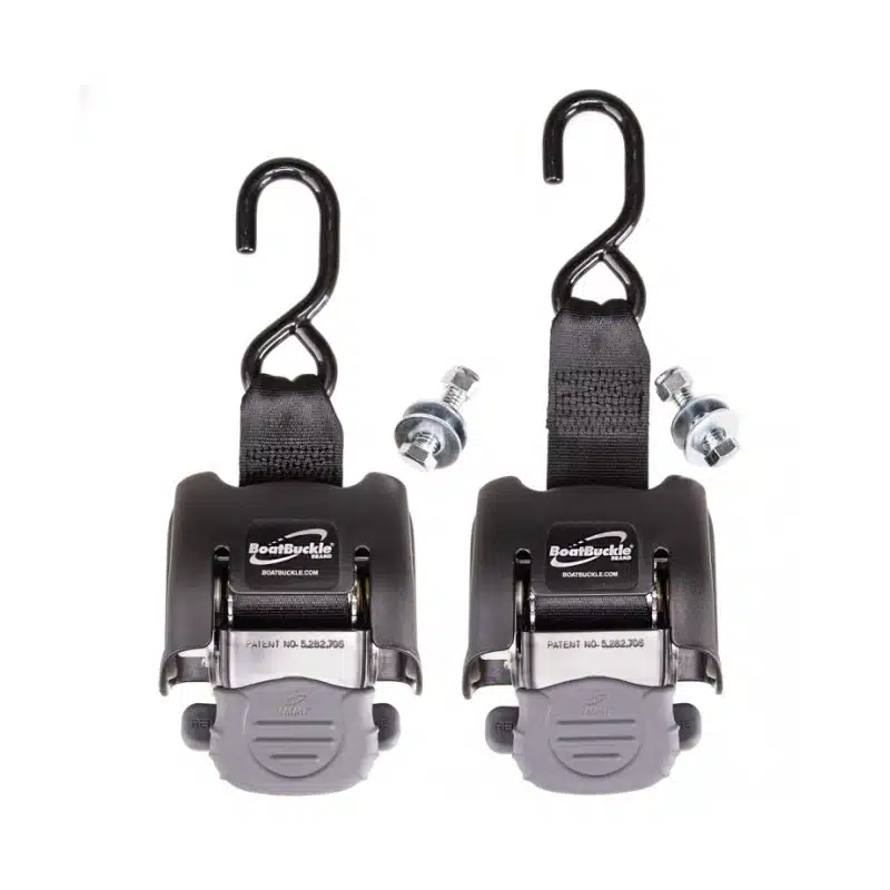 BoatBuckles 2-pack är ett självupprullande spännband för att spänna fast båten till trailern.